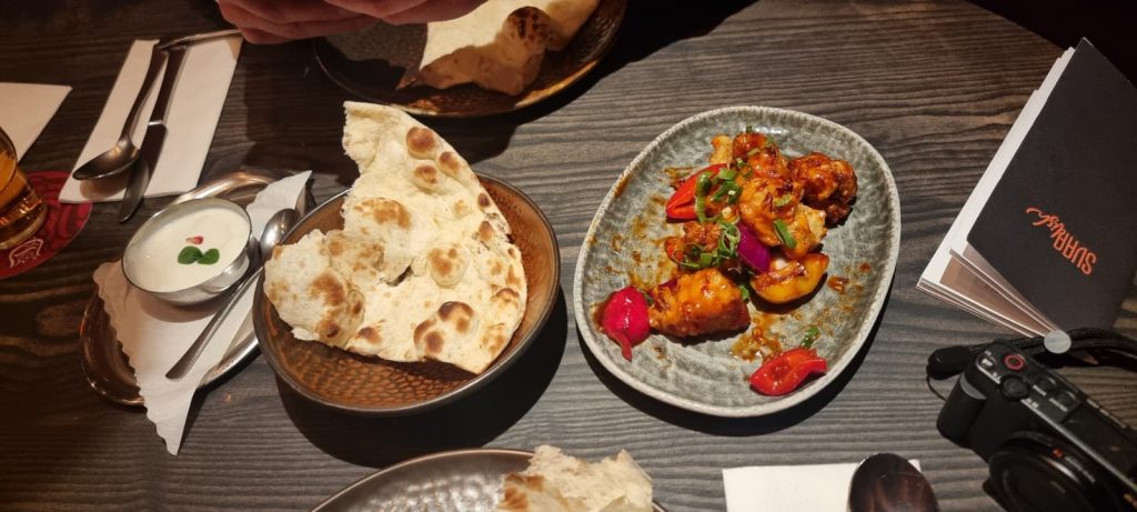 Frittierter Blumenkohl in einer süßen Chilimarinade. Dazu Naan und Raita, ein Gurken-Joghurt-Dip.